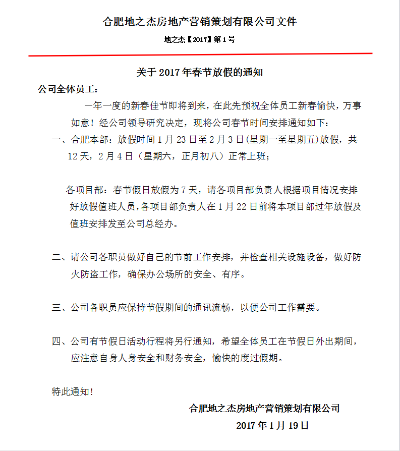 关于2017年“春节”放假的通知