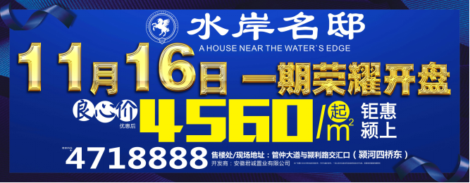 水岸名邸位于颍上县管仲大道与颍利路交叉口,总建筑面积约6万平米, 106-155平米精品住宅 ,繁华沿街商业,抢购热线:0562-2208888。  合肥地之杰房地产营销策划有限公司 2017年11月20日 |